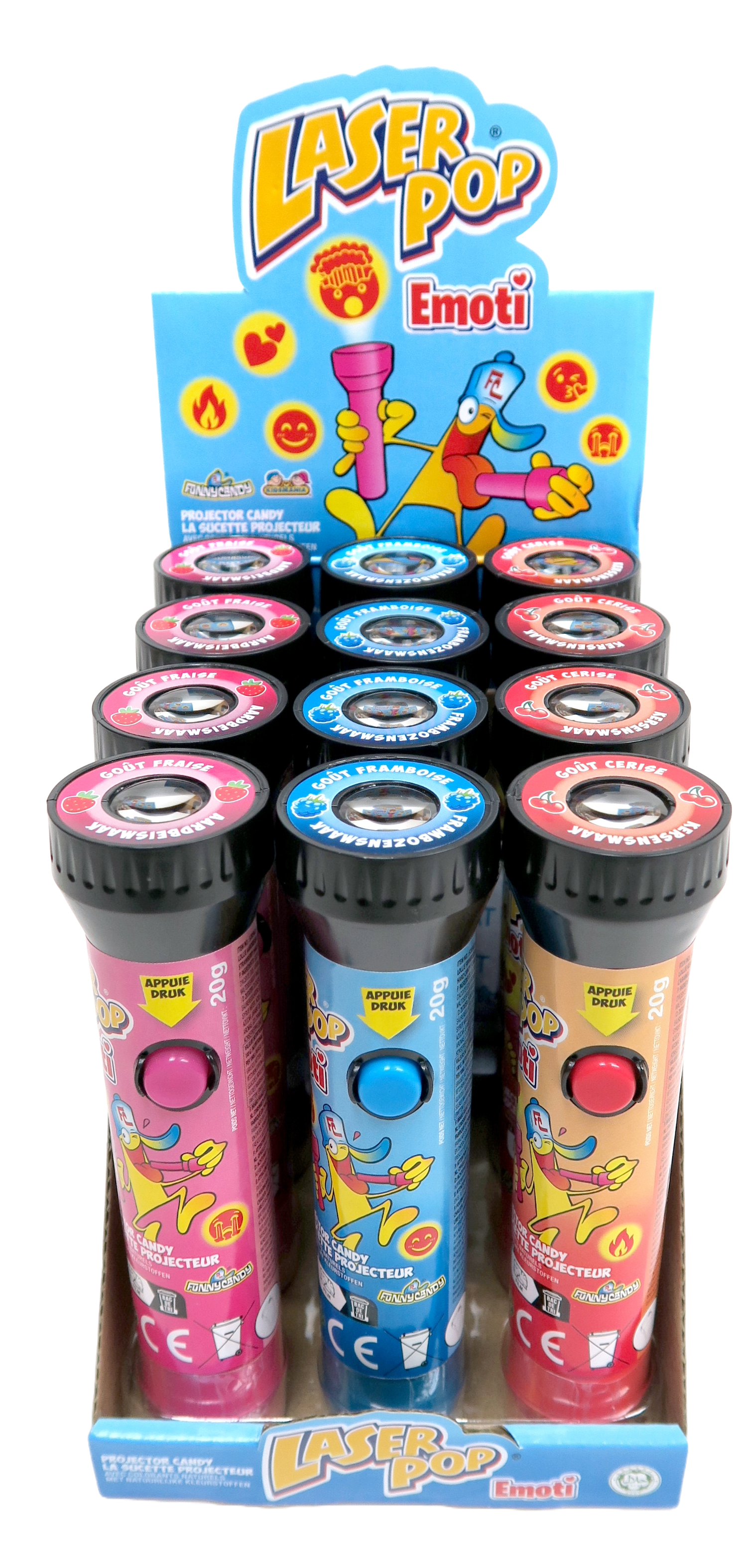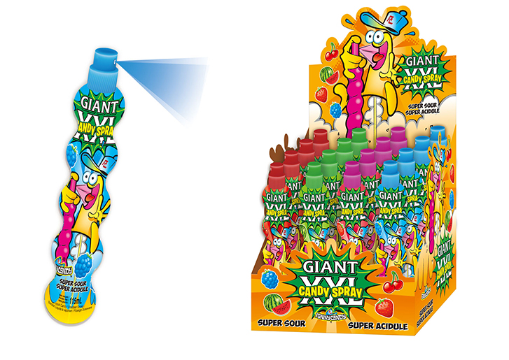 Un grand bonbon 2 en 1 de 25 cm : un spray de 50 ml au dessus et un tube de poudre acidulée de 80 gr en dessous. 3 associations de parfum différent: fraise/ Cola, framboise/ fraise et cola/ framboise.