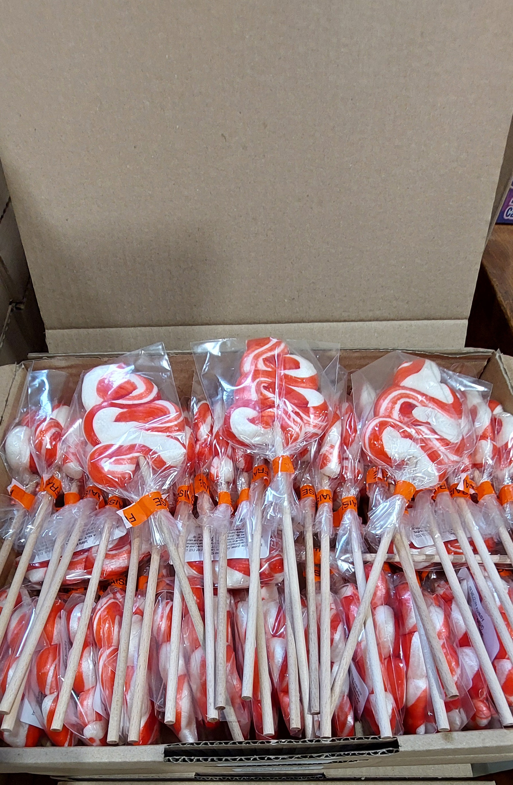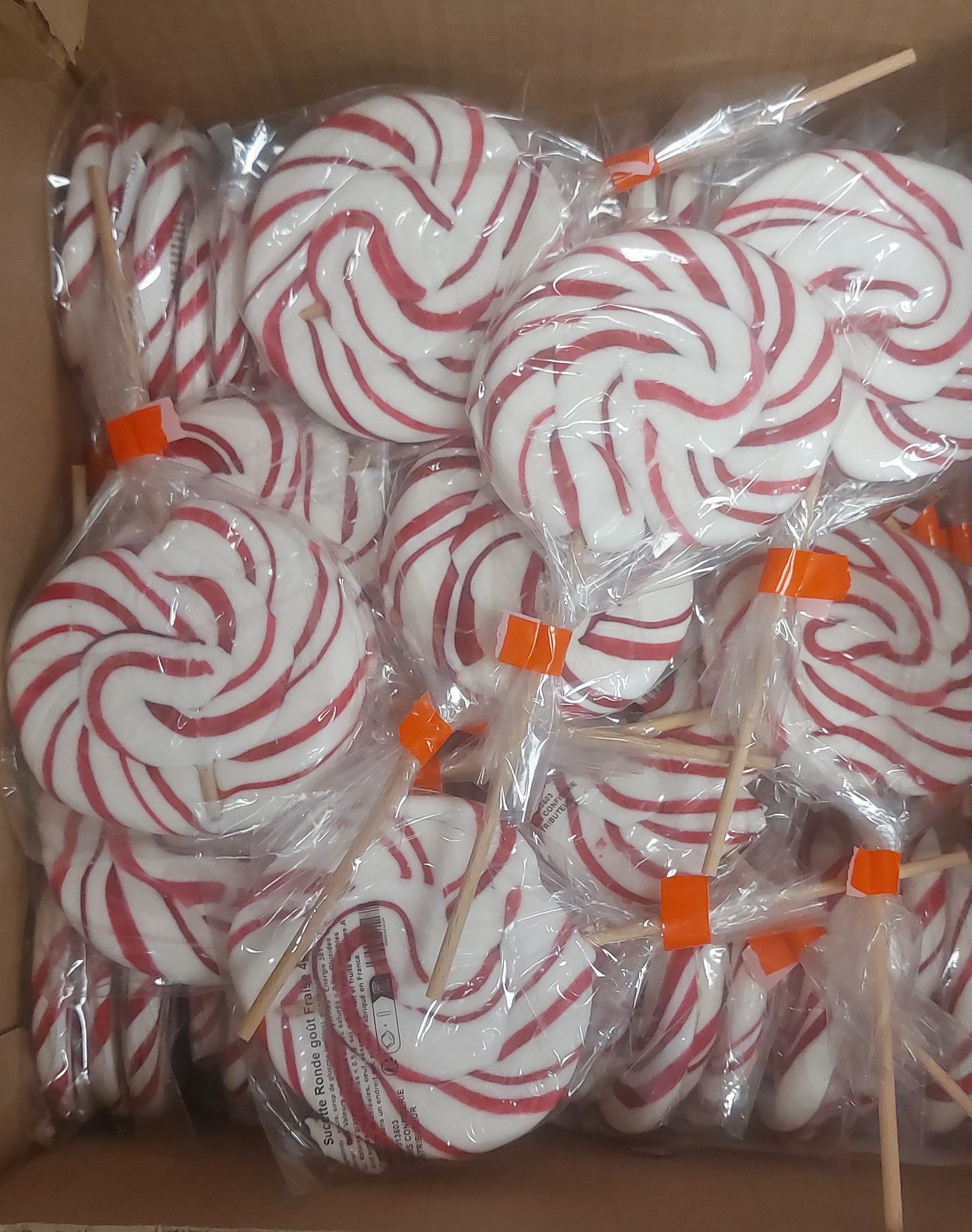Carton de 50 Sucettes en forme de sapin, moyen modèle, rouge et blanche, goût fraise, emballées séparément de 40 gr.Sucette artisanale. fabriqué en France